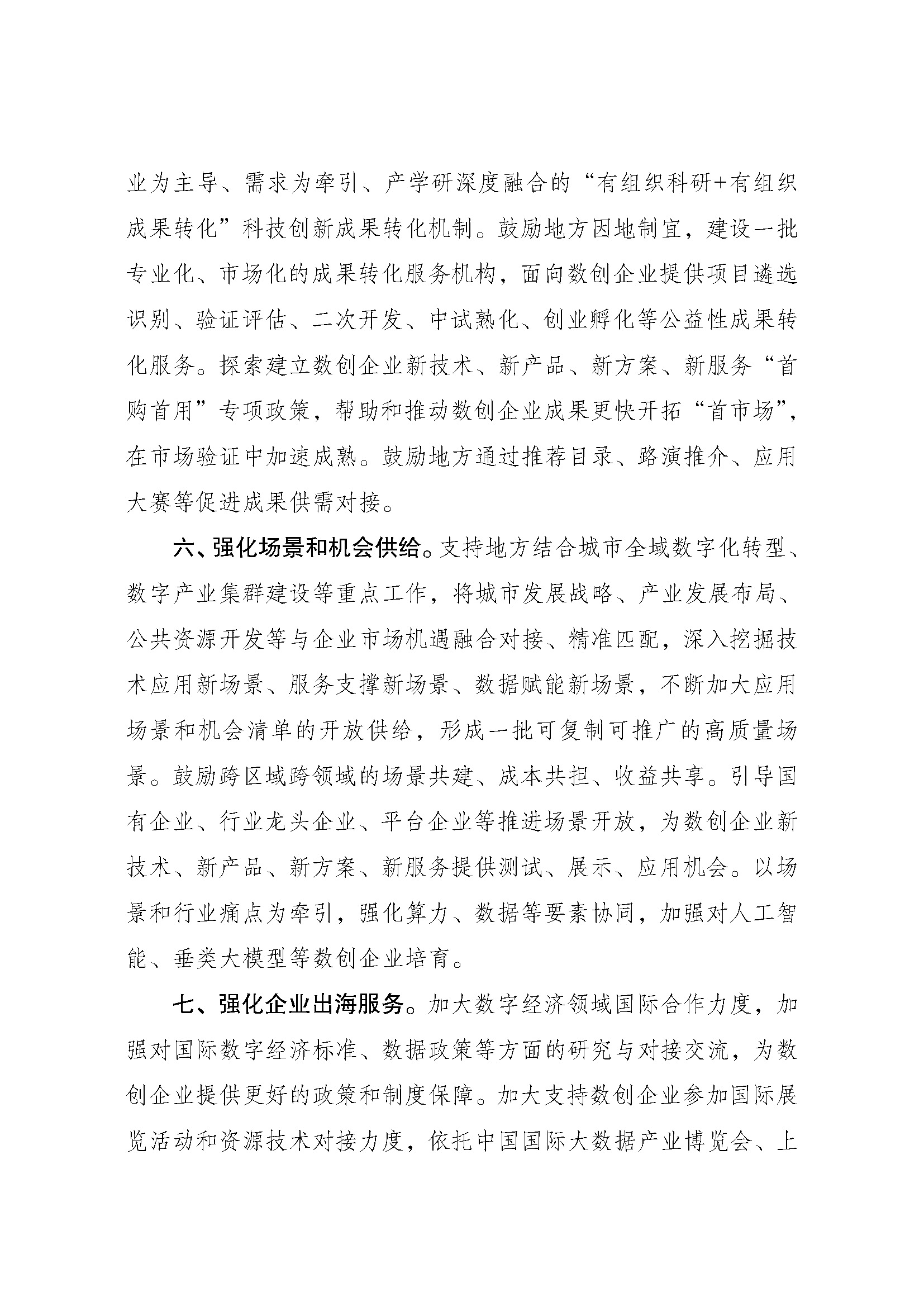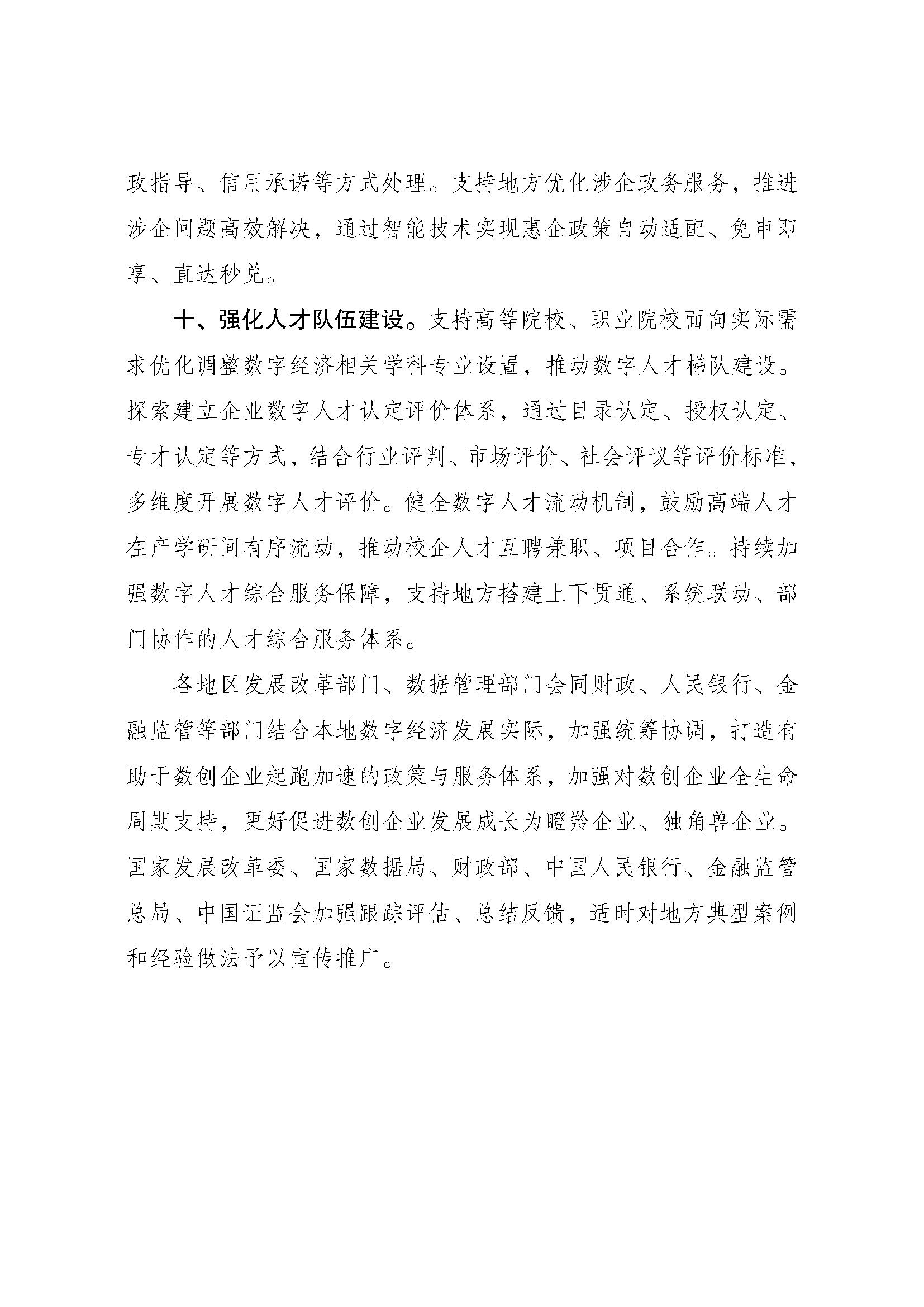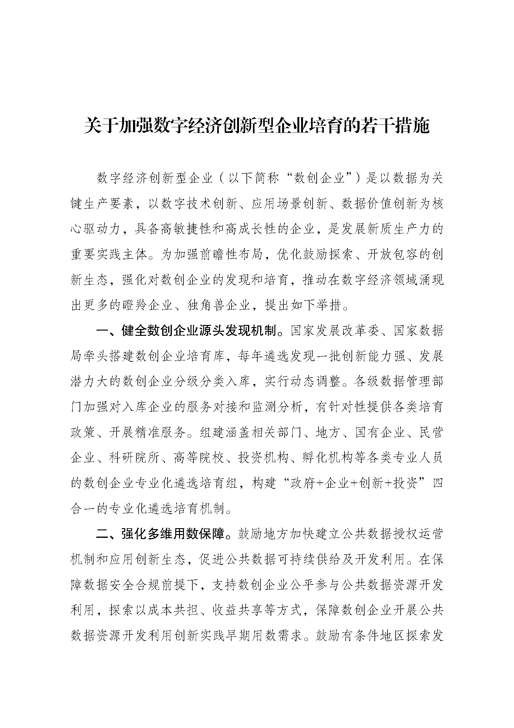 为加快培育数字经济创新型企业,让更多企业在数字经济新领域新赛道跑出加速度,推动涌现更多瞪羚企业、独角兽企业,国家发展改革委、国家数据局、财政部、中国人民银行、金融监管总局、中国证监会组织制定了《关于加强数字经济创新型企业培育的若干措施》。现印发给你们,请遵照执行。