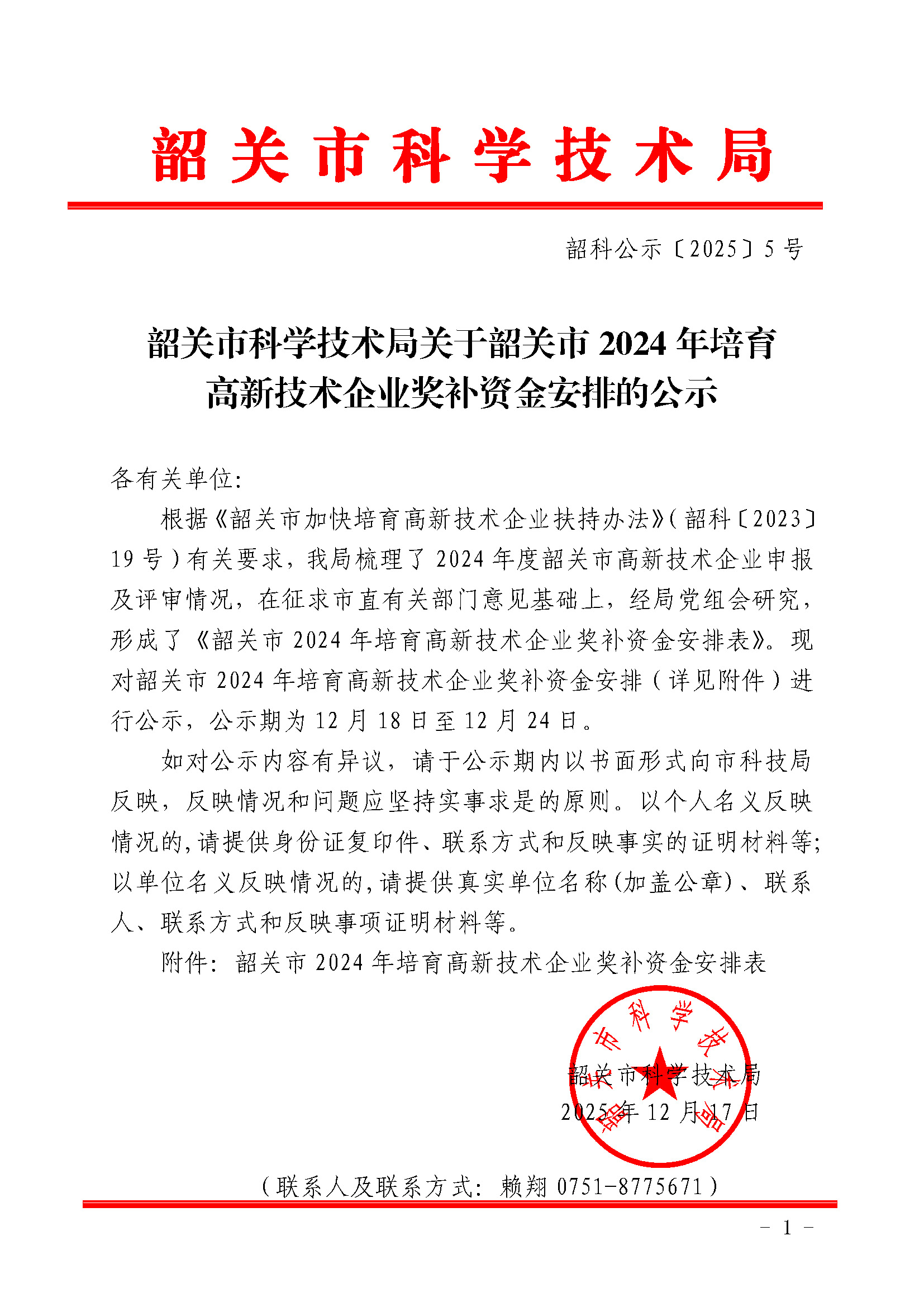韶关市科学技术局关于韶关市2024年培育高新技术企业奖补资金安排的公示